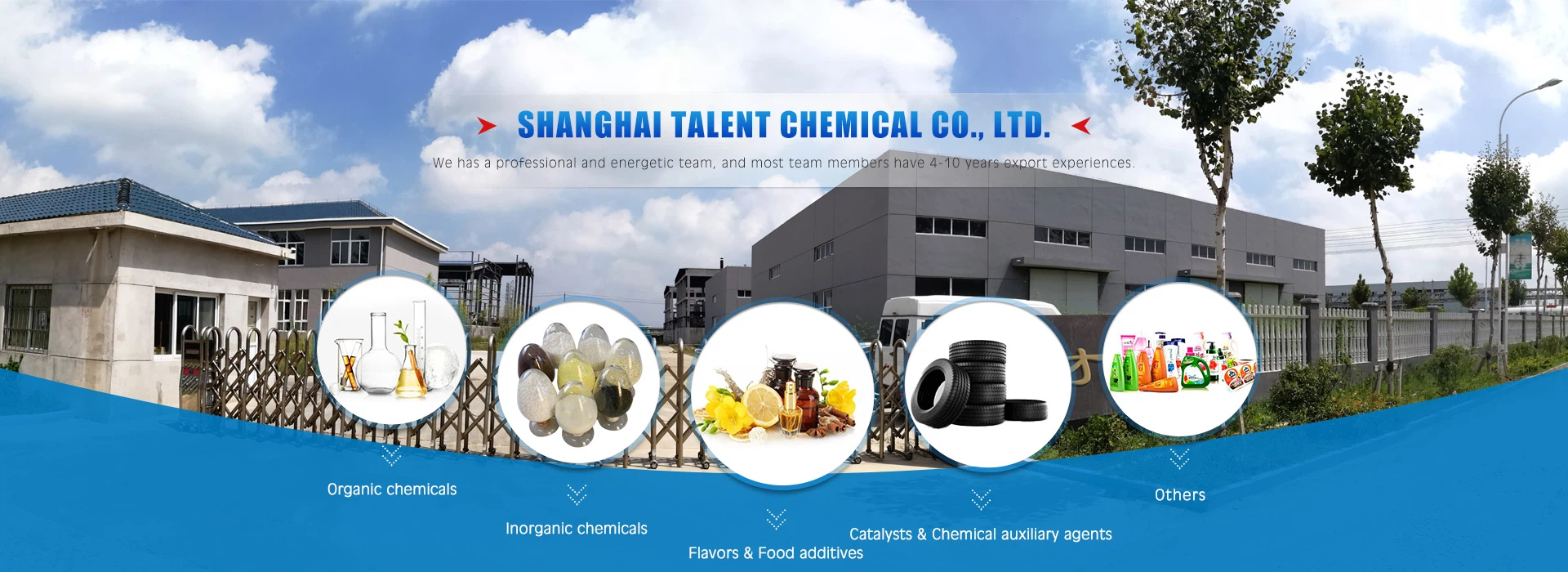 Shanghai Talent Chemical Co., Ltd. ממוקמת במרכז הכלכלי של סין---שנגחאי, שיש לה למעלה מ-30 עובדים ו-450㎡ משרדים כעת. אנו מתמחים באספקת מוצרים כימיים בשפע כדי לענות על דרישות הלקוחות, ויכולים גם לספק שירות מוצרים מותאמים אישית. נכון לעכשיו, אנו מייצאים בעיקר כימיקלים אורגניים, כימיקלים אנאורגניים, חומרי טעם וריח ותוספי מזון, זרזים וחומרי עזר כימיים וכו'.